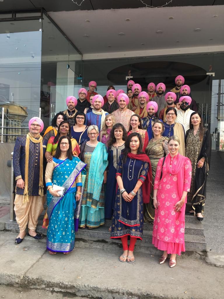 Die Fahrt zum Hotel vergeht aufgrund der vielen Eindrücke wie im Fluge. Einchecken und eine schnellen Dusche und schon sind wir wieder auf den Beinen. Zeit zum Ausruhen gibt es nicht. Fast alle brauchen noch passende Kleidung für die Feierlichkeiten. Ethnisch soll sie sein. Das heißt, wir wollen uns im klassischen Stil der Punjabis kleiden. Also auf in die nächste Mall! Begleitet von einer lieben indischen Freundin stürmt die Gruppe „rosa Elefanten“ ein entsprechendes Fachgeschäft für festliche Kleidung. Das Portfolio des exklusiven Textilanbieters erinnert an den Fundus eines Bollywoodfilms. Ein wahres Farbenmeer an Stoffen, Kleidern, Hosen, Schuhen, Schals und anderen Accessoires wird von eifrigen Verkäufern vor uns ausgebreitet. Sie werden nicht müde, auch den letzten Faden aus dem Lager zu präsentieren, und manch einer verwandelt sich mit Kurta, Pluderhose und anderen märchenhaften Kleidern aus 1001 Nacht in eine verführerische Sherazade oder festlich rausgeputzten orientalischen Fürsten. Änderungen, Sonderwünsche und ganze Maßanfertigungen setzten die flinken Näher gleich vor Ort um. So vergeht der Nachmittag und mit Tüten und Taschen beladen kehren wir ins Hotel zurück.